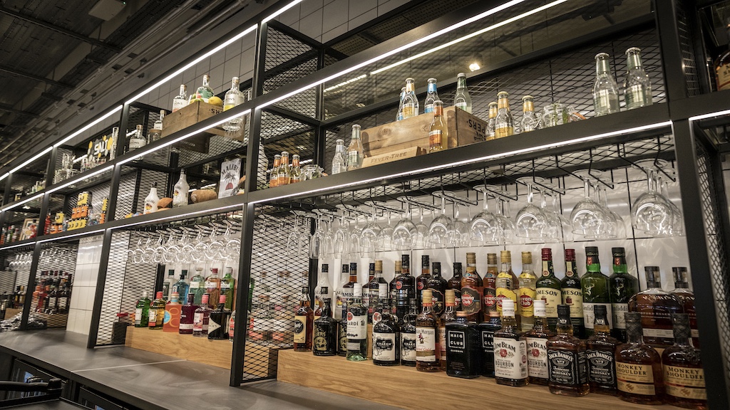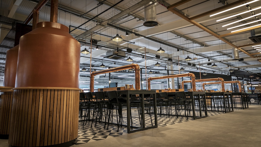 In common with all Tap & Brew bar restaurants, the design is influenced by the feel of a brewery and also the industrial heritage of the region where both Leeds and Bradford have played an important role in Britain’s industrial story. Concrete effect floors, the dark, tiled bar front and hanging feature light fittings celebrate this spirit. The dark metalwork pays tribute to the abundance of steel in some of the remaining industrial buildings in the area such as the Corn Exchange in Leeds and the use of timber reflecting the importance of wood during the region’s Victorian, industrial heyday. Large copper tanks and exposed piping emphasise the craft brewing theme, creating the impression that beer is freshly stored on site and poured straight into customers’ glasses.