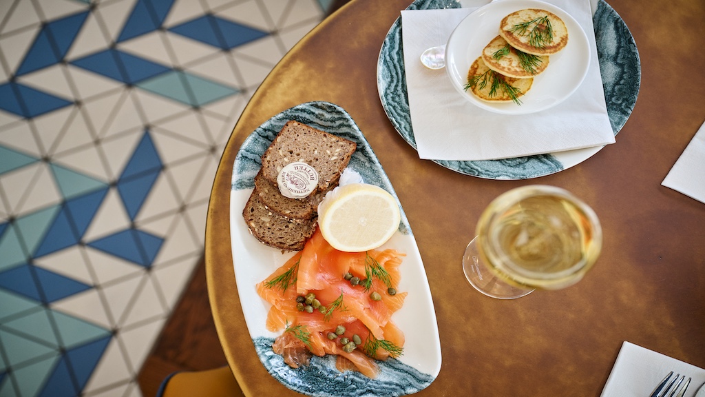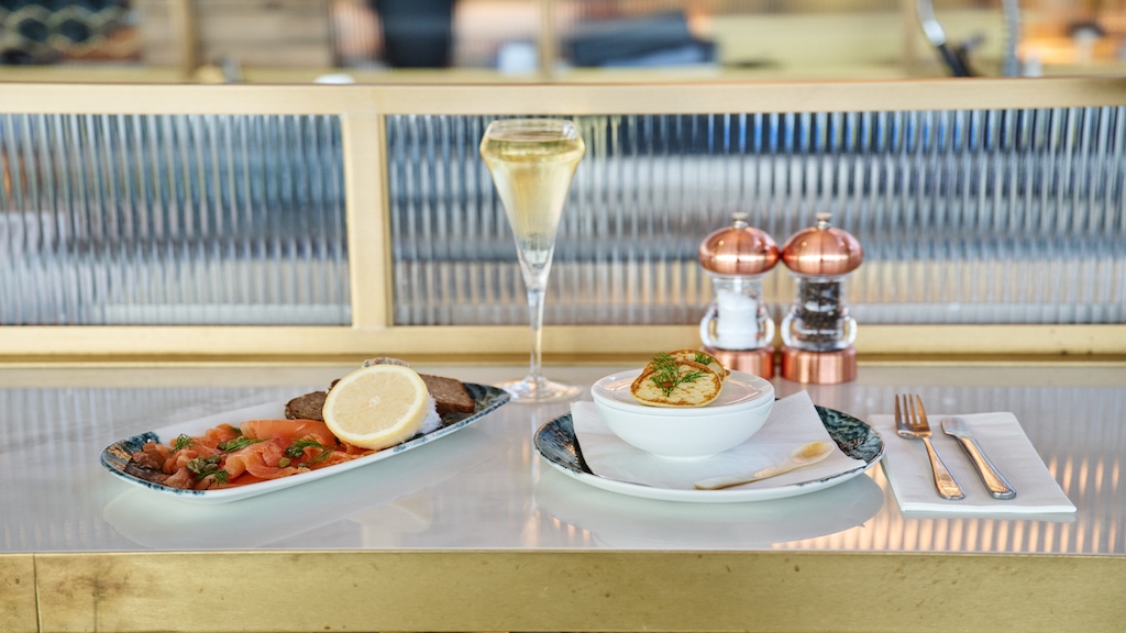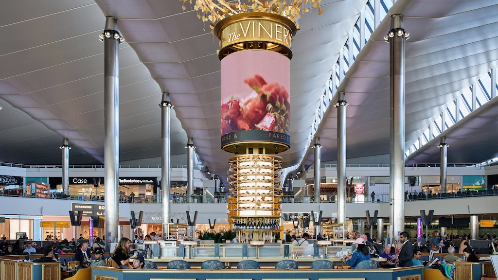 The Vinery is a premium bar at the heart of the T2 departure hall at Heathrow. The Vinery is a showcase of English food and wine. Guests are attracted to the unit through a combination of a prominent video display and the plume of brass vines at the top of the unit as soon as they exit security on the mezzanine above. The low level perimeter walls of the unit are clad in oak, reminiscent of the oak staves of a wine barrique and are trimmed in brass. The central wine display signals the breadth of the offer. Banquettes and lounge seating in the unit are finished in sumptuous blue and light tan leather. The Vinery is a fitting, premium addition to the UK’s leading airport.